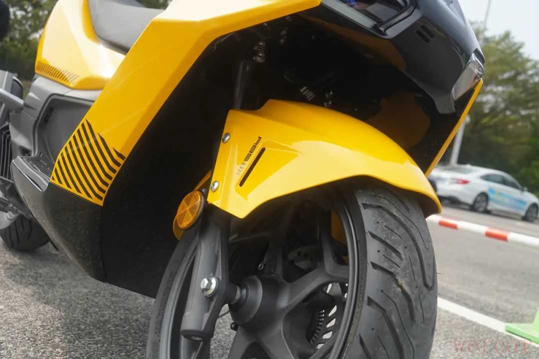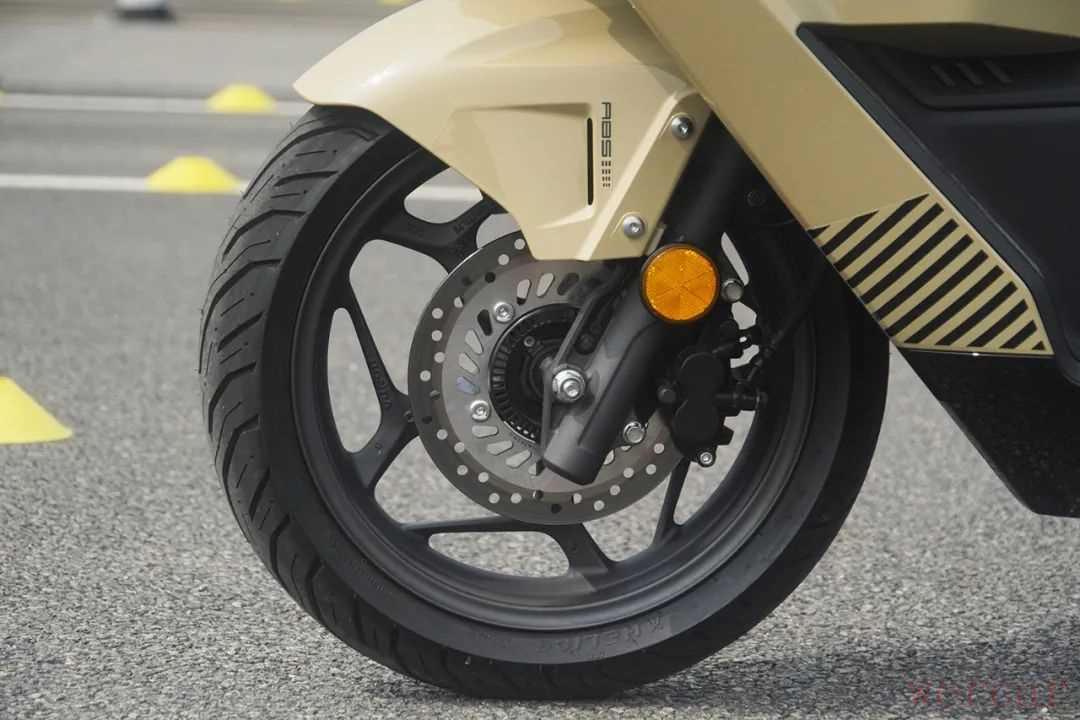 NWG的轮胎规格为前110/70-14后130/60-13,原厂配套轮胎是赫璐的CY347半热熔轮胎。这套轮胎的配方在干燥路面上表现出的抓地力足以让人信赖,胎型花纹也贴合NWG150主打日常城市路况兼顾一定的湿地性能。制动部分的硬件来自航特,这个级别常见的固定盘搭配前双后单活塞卡钳的配置。在NWG150这个级别的车型上,航特提供的制动系统已经能做到的与日信等国外品牌极为接近,制动前段的空行程不多,手感硬度适中且灵敏度线性,最大制动力也足够。电控部分NWG150配备了来自博世双通道ABS和TCS,在紧急制动测试中,后轮大力刹车ABS系统工作判定十分敏捷,相比只搭载前轮ABS的车款,小编几乎感知不到车身和后轮有向侧面偏移的现象。
