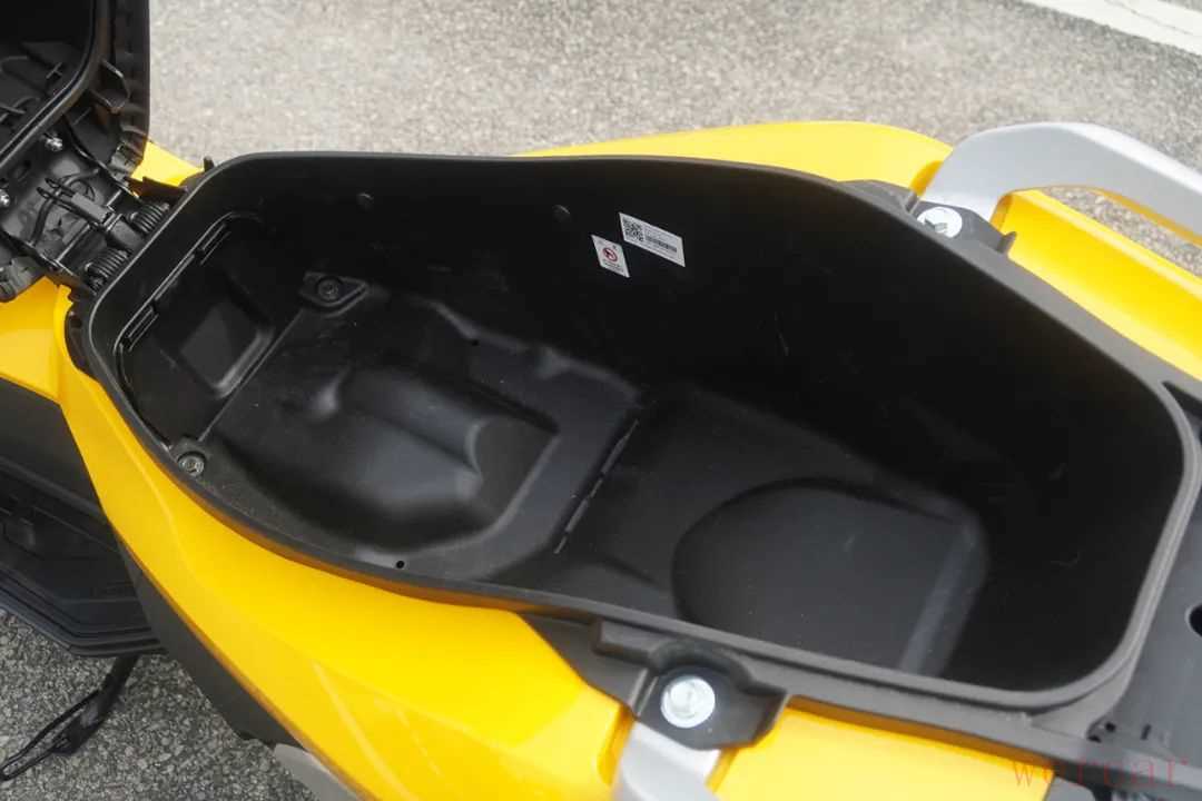 打开座垫,座下的30L容积储物仓能够容纳两顶半盔或是一顶标准尺寸的全盔加上日常骑行备用的雨衣等物品,这部分储物能力我们可以看做是等同于PCX,是当前这个级别的车型中的顶尖水平。