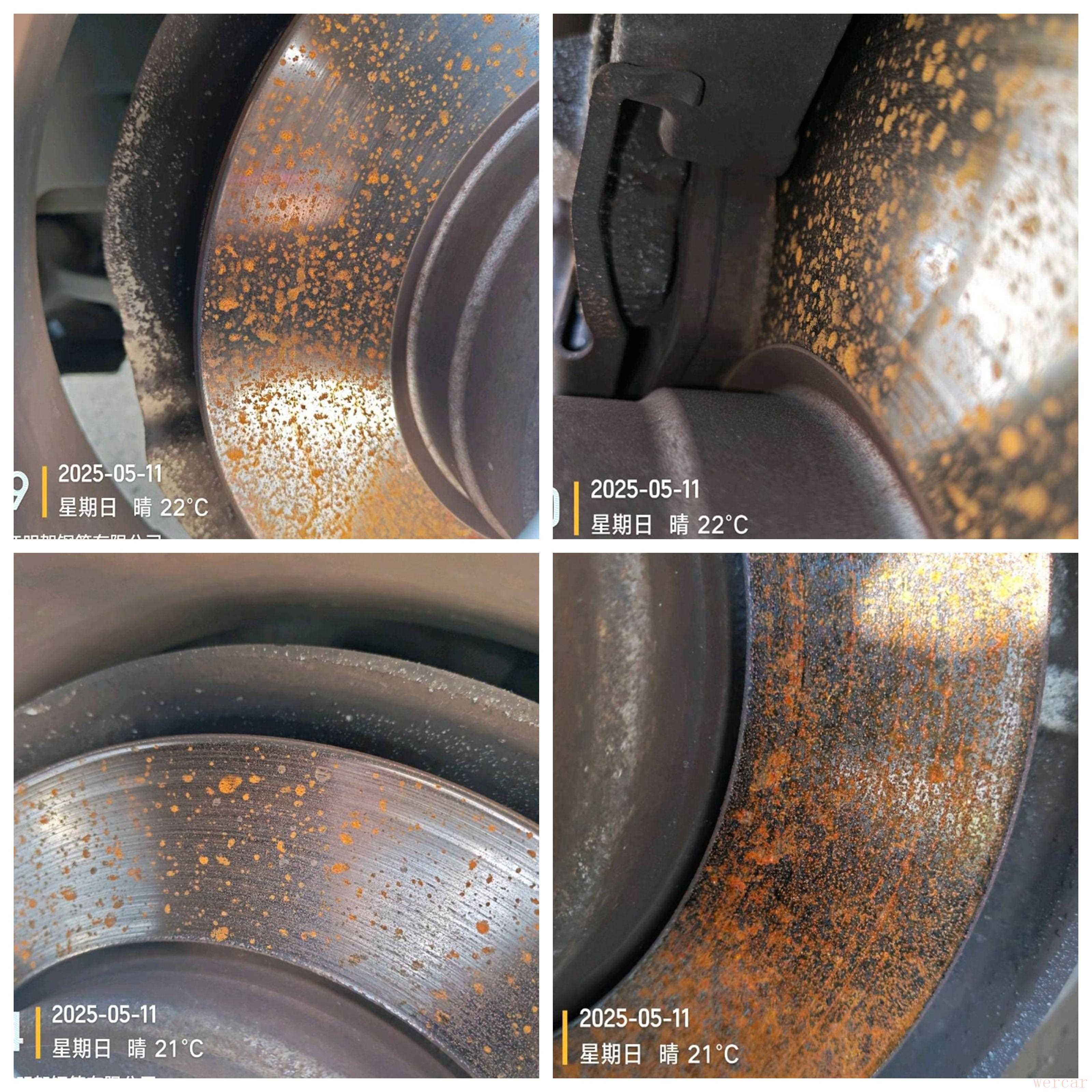 经查验,发现受检车辆的四个车轮的刹车片均存在更换,两个前轮的刹车盘均存在更换,两个后轮的刹车盘均存在不同程度的起槽磨损。