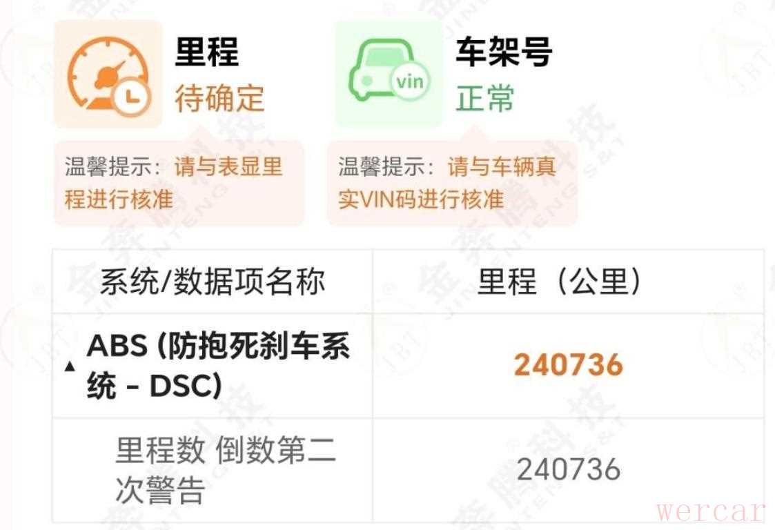 接下来读取车辆的历史里程数据,可以看到ABS数据和倒数第二次警告数据都显示这辆车已经开了超过24万公里了,结合内饰和刹车的磨损程度来看,可以确认车辆有过调表。