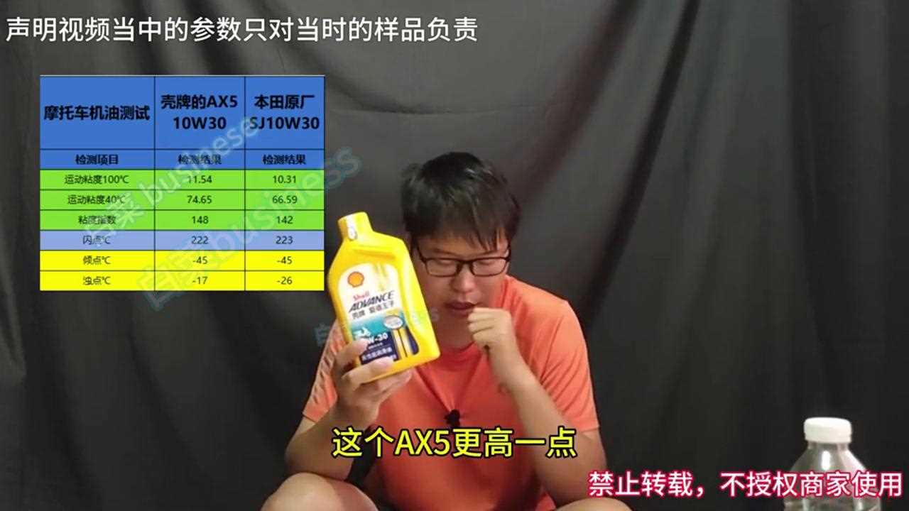 ·100度运动粘度,AX5是11.54,本田白瓶是10.31。粘度AX5更高一点,它耐久或者夏天的表现会比白瓶要好一点。