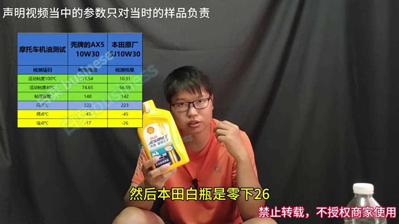 大家好,这期测评的是这款摩托车机油,壳牌的AX5,踏板专用的10W30。它这上面有标是SLMB的认证,符合认证。这款油对比对象就是本田原厂那款sJ的10W30的油,就是白瓶那款,就是比较便宜的本田原厂是那款油。有视频往前翻,是有视频的详细测评。