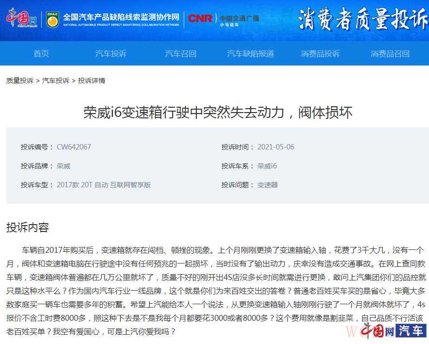 申先生告诉记者,经过自己查询发现,网上有很多同款车的变速箱阀体均在行驶了几万公里后就损坏了。质量不好的刚开出4S店没多久就需要更换。“敢问上汽集团,你们的品控就只是这种水平么?作为国内汽车行业一线品牌,这就是你们对车主交出的答卷?”申先生气愤地表示。