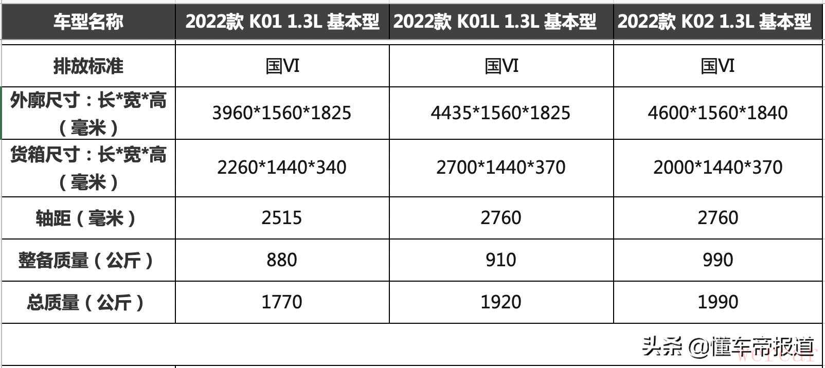 从车身结构来看,东风小康K01属于2门2座微卡,东风小康K02为4门5座微卡。在车身尺寸方面,K01长宽高分别为3960/1560/1825毫米,轴距为2515毫米。同时,K01L可视为K01长轴版本,其长度相比K01增加475毫米,轴距增加245毫米。此外,K02为双排车型,该车长宽高分别为4600/1560/1840毫米,轴距为2760毫米。