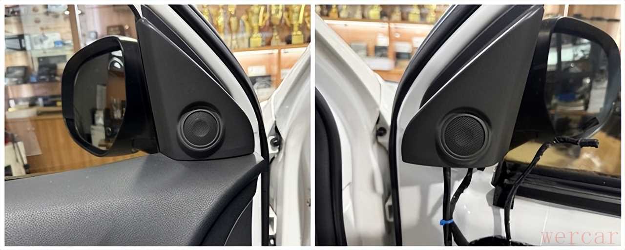 车门三角区经过精准倒模,嵌入劲浪ASE-165高音喇叭。此举不仅提升声场高度,使音像定位更精准,还与原车内饰无缝融合,保留美观性。