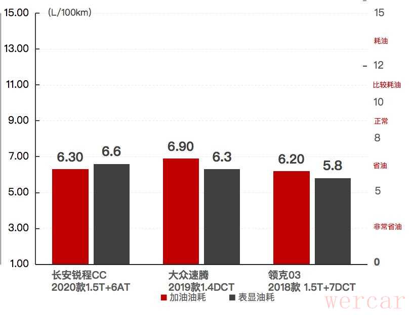 锐程CC实测6.3L/100km的油耗成绩可以说是比较省油的了,虽然官方定位为中型轿车,但实际上是以准中型车的尺寸与合资品牌的A+级轿车错位竞争,其油耗表现也不输合资品牌竞争对手。锐程CC搭载的1.5T发动机数据不算亮眼也没有用上直喷技术,不过长安的这套1.5T+6AT动力总成在旗下多款车型都有应用,老是老了点但胜在匹配成熟,燃油经济性也不错。
