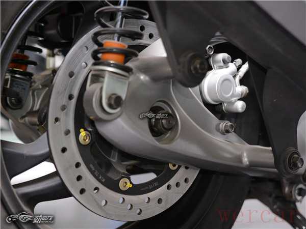 前制动的配置很强悍,采用了单钻孔盘配对向6活塞卡钳。