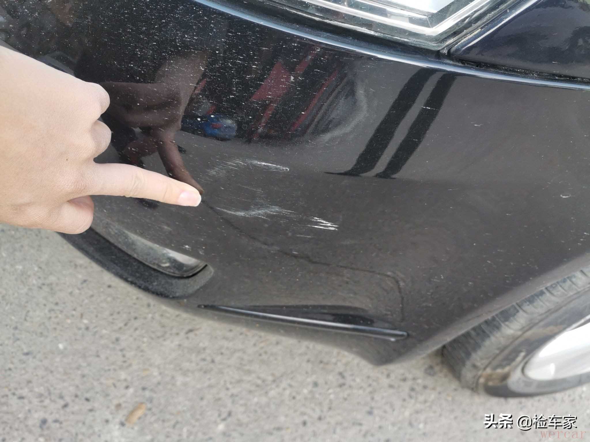 前保险杠左前角刮擦,小问题,但影响美观,客户应该不介意这些。又看了前杠固定螺丝和塑料卡子,没有拆装更换,但有过补漆修复。