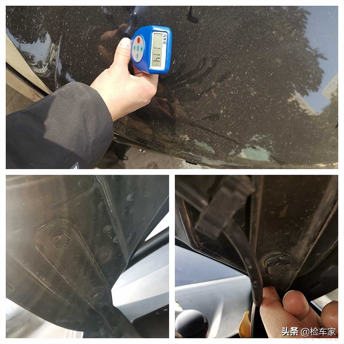 引擎盖的漆面厚度在正常范围,边缘也没有毛渣儿刺手的感觉,说明还是原厂漆。再看引擎盖的铰链螺丝,右边螺丝没有拆卸痕迹,但左边两颗螺丝拆过,还有位移。结合左侧翼子板的情况,估计是引擎盖左边受到刮蹭挤压造成缝隙不一致,调了缝隙。