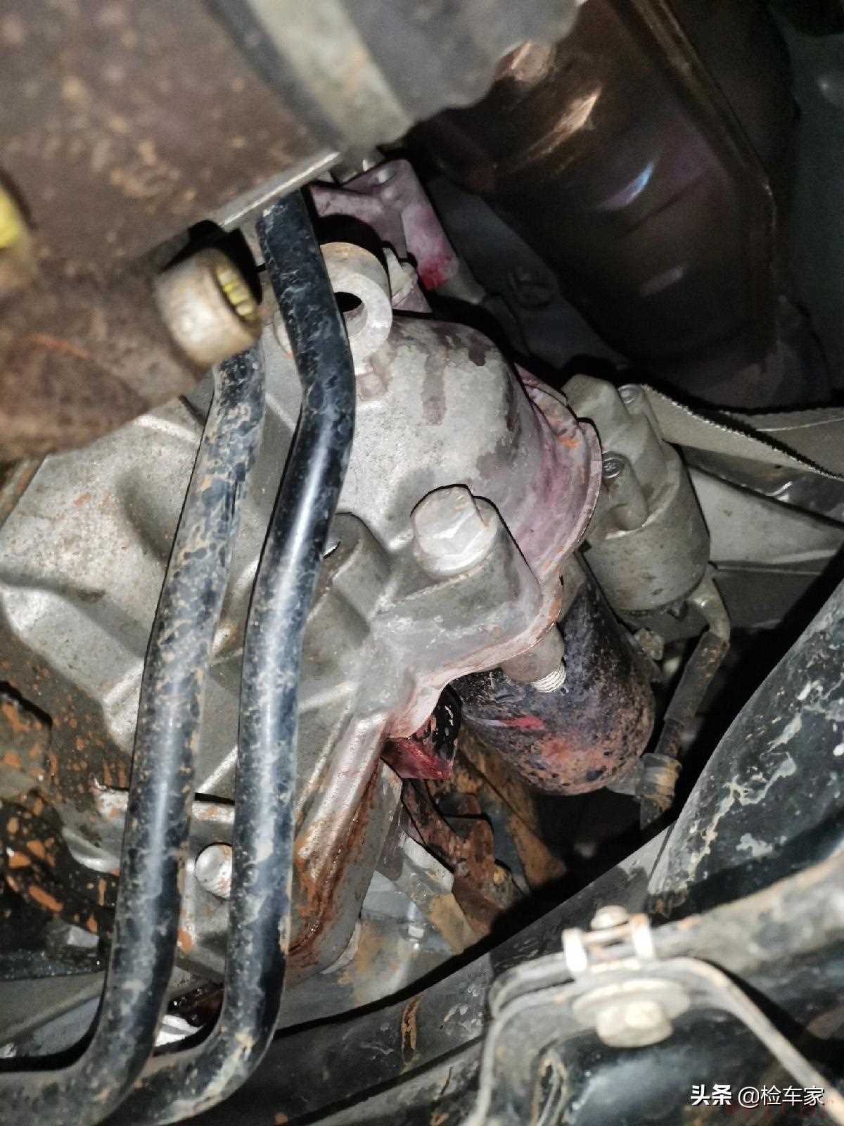 最后检测底盘,车子顶起来的第一时间就看了下发动机变速箱连接螺丝,没有拆卸的痕迹,说明发动机没有吊装。但是发动机壳体上面洒了很多红色的液体,这是防冻液漏了!到处都是!也不知道现在还漏不漏?