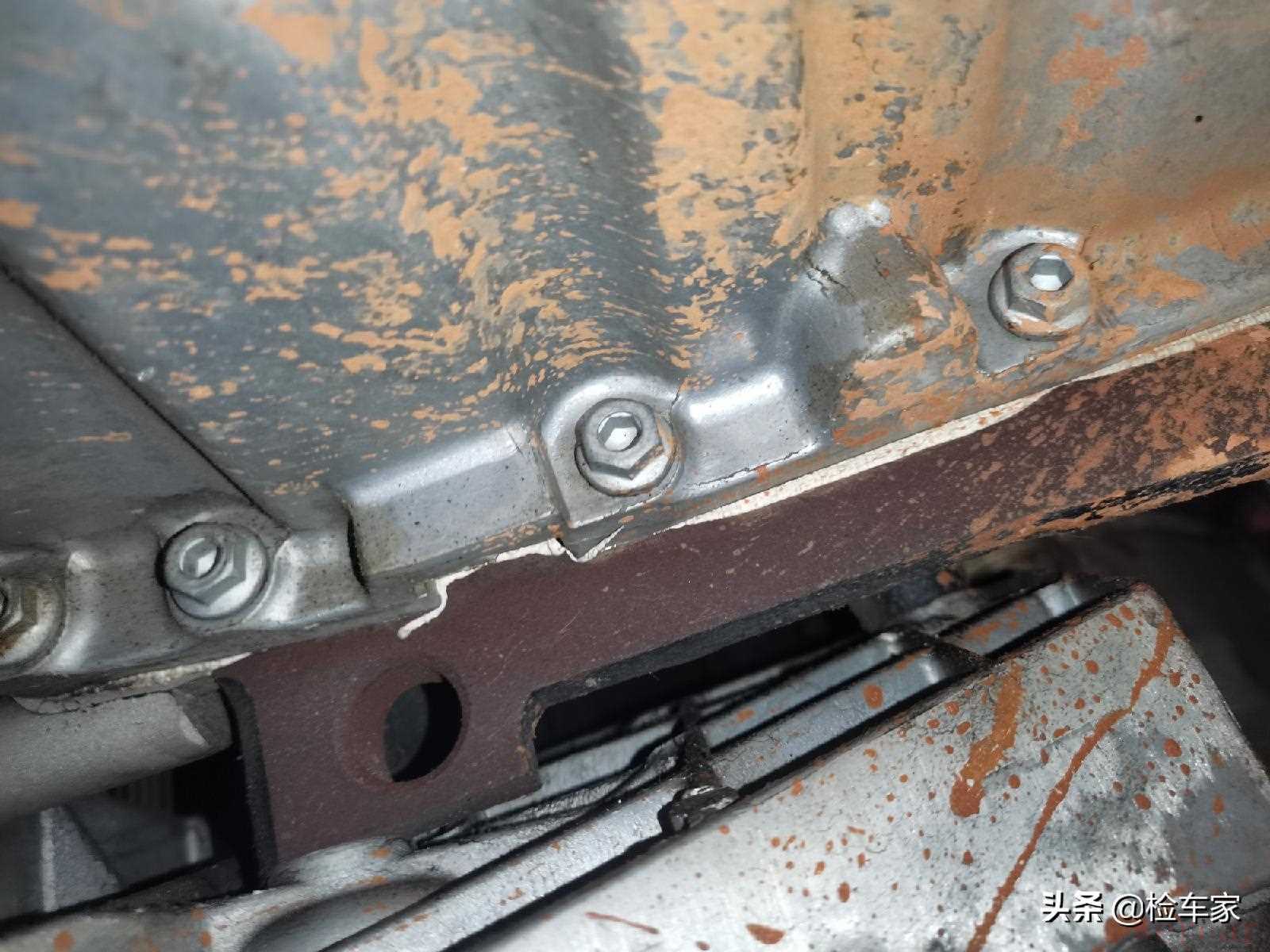 发动机的油底壳有修复打胶的痕迹,应该是处理渗油的问题,目前看着没问题。