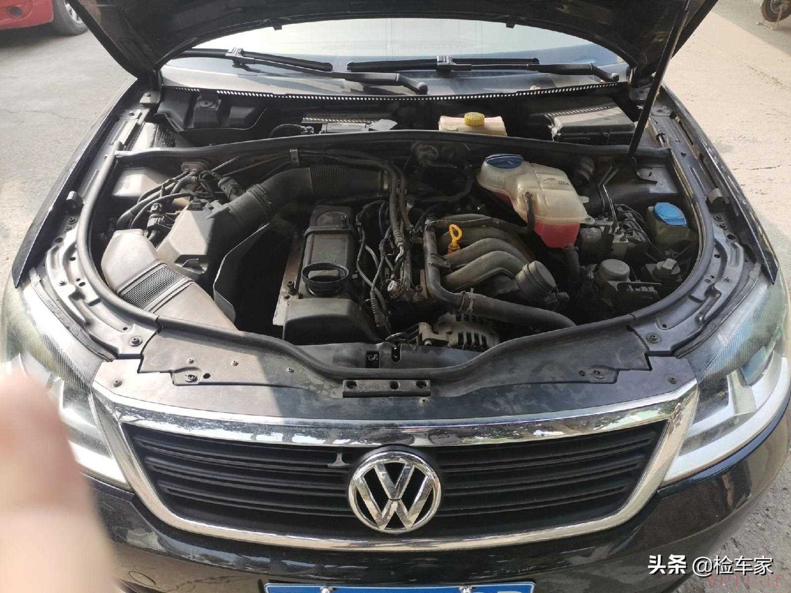 回到车头检查发动机,虽然1.8T才是帕萨特B5的灵魂,但2.0自吸更稳定一些,因为气缸里面的压力和温度都要低一些,当然它也摆脱不了烧机油的顽疾。可以看到是纵置布局,变速箱这块还得上举升机才看的到。