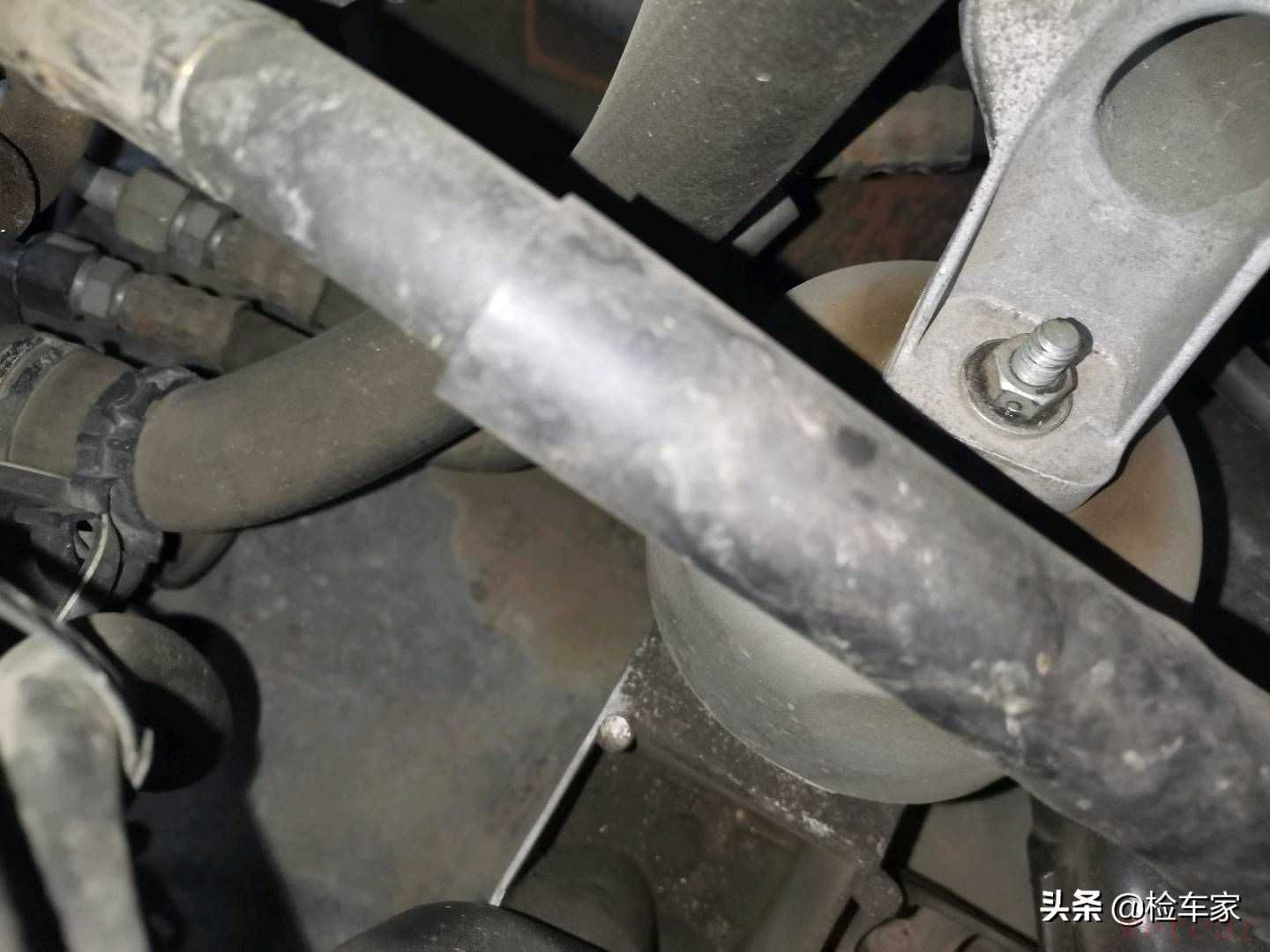 底盘没有严重托底的情况,四条减震还是原厂的,也没有渗油漏油的现象,元宝梁螺丝没有拆卸痕迹,说明悬挂没有拆装换件,又进一步证明发动机没有过吊装。