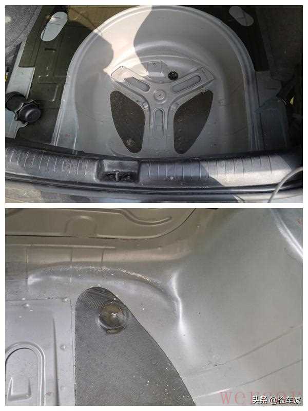 备胎仓很干净,不过临近后围板的地方有一处变形,应该是倒车的时候下面磕到了石头或者桩子之类的,因为外层的后围板都没有变形钣金,碰撞不可能越过后围板直接接触备胎仓,只能是来自底盘下面。