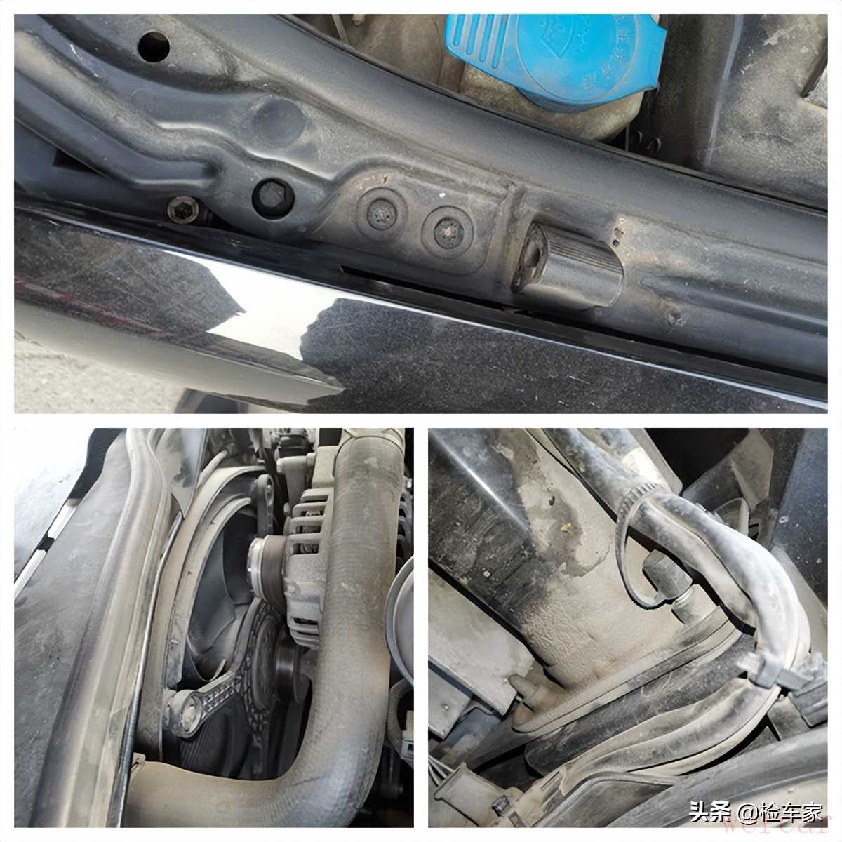 看一下发动机舱里面的翼子板螺丝,螺丝表面有摩擦掉漆的拧动痕迹,说明翼子板拆下来过。不过起支撑作用的翼子板梁没什么事,问题不大。