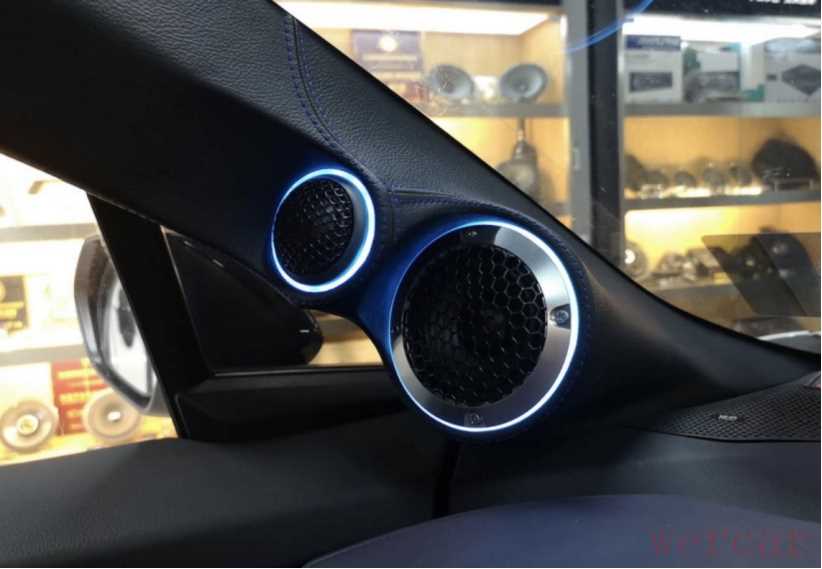 前声场采用的那套德国RS竞赛三分频套装喇叭,能精准地把低中高频进行分离,在声音细节的表现拥有更佳的表现。在落地安装该喇叭套装时,改装师傅通过倒模的方式将它安装在CHR的A柱上,同时在高音和中音喇叭外围加入蓝色氛围灯,使其在声音表现和视觉表现上都给人出乎意料的惊喜。