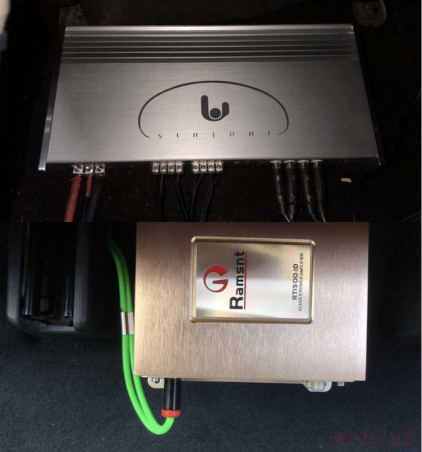 而为了保证上面的这套喇叭系统的发挥,所以在正副驾驶座位的下方分别安装了一台诗芬尼MA95.4功放和一台德国威玛仕1200.1单路功放,以保证每一个喇叭的实力都可以出色发挥。
