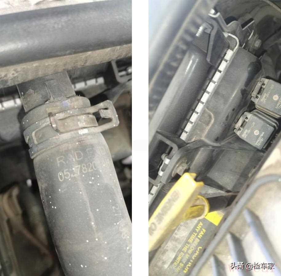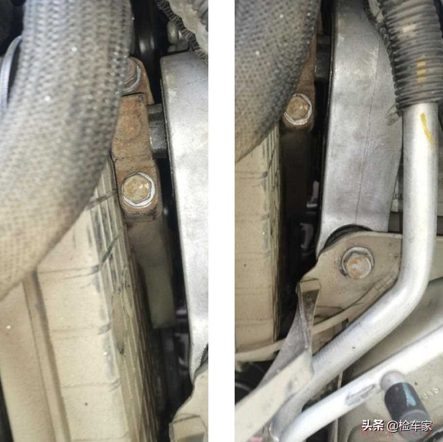 我直接打开机盖检查前防撞梁和水箱框架有没有拆装和更换,可能明显的看到前防撞梁有变形和拆装的痕迹,但是没有更换只是重新敲补过,螺丝也有拆装。由于这款车的保有量非常少,估计是配件不好买吧,所以没有更换。