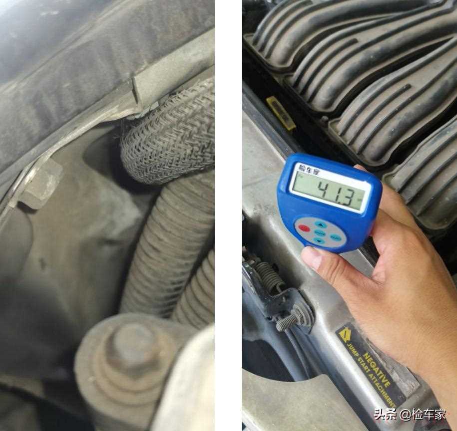 而且后面两个避震也漏油,胶套都坏了,所以从这些磨损的情况,加上刹车盘和刹车片的磨损可以得知公里数和仪表显示确实不符。那到这里两个多小时的检测就差不多结束了,这辆车外观喷漆修复的地方多,而且右A柱内测有过钣金喷漆修复且超过八cm,钣金数值超过400um,属于国标事故车;前防撞梁有变形,发动机有大修,内饰的检查公里数和仪表显示不符,右前半轴球笼漏油,后面两个避震漏油需要换。总的来说车况不是很好,不过对于它的车龄来说,也不是不可以接受。