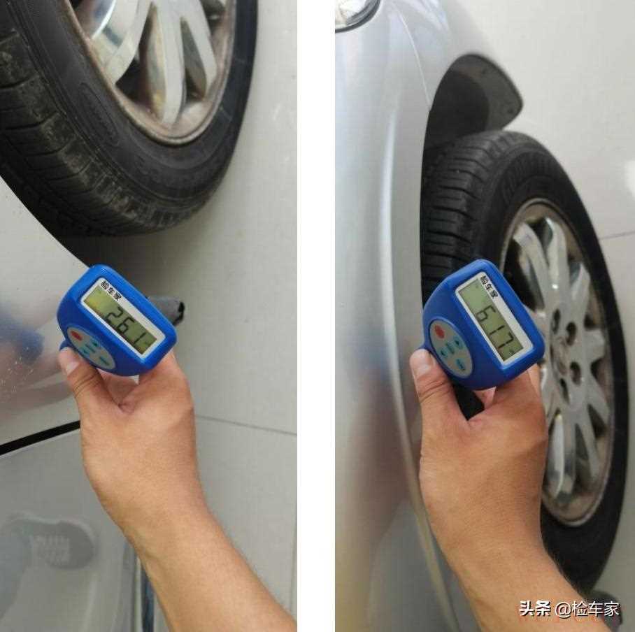 接着检测右后边的时候,发现右后翼子板的位置也是有钣金喷漆修复的情况,上边的右D柱也有喷漆的情况。因为右D柱的位置和右后翼子板是一体的所以喷漆是应该为了保证喷漆过后不留下色差,连带着喷上去。