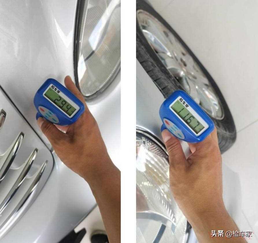 随后用设备检测了左前翼子板的位置,漆面数值高达1167,存在钣金喷漆修复,而且这个位置很靠近大灯,加上大灯的成色也新,可以断定大灯是有过更换的。然后我仔细检查了左边一侧的漆面数值,都是正常的,可以知道左边就只有左前翼子板有过钣金喷漆,其它是原漆。