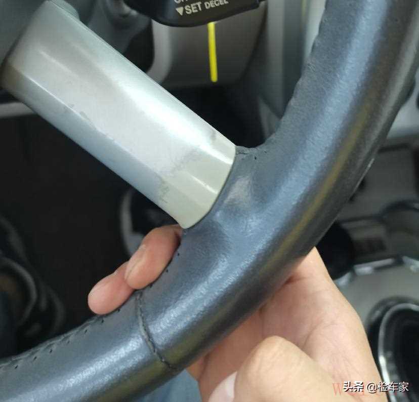 然后我又仔细检查了方向盘的磨损,也发现方向盘掉漆很严重。不过由于这款车现在买不到了,早就停产了,外面的电脑都不能进入系统读取公里数。但是通过内饰的磨损和前面发动机配件的拆装以及发动机机脚的螺丝拆装,可以判断公里数和仪表的显示不符。还好内饰里面的功能都还齐全,而且按键都还能用,这可能就是一大亮点了。内饰检查完毕,接下来咱们就去看一下底盘。
