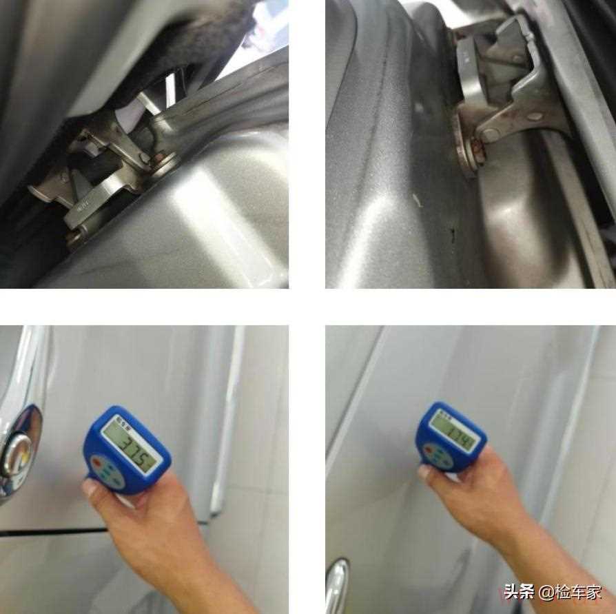 检测到右前面的时候,虽然说钣金喷漆的数值比较小,不过右前门的铰链螺丝有过拆装。当时我还以为右侧的位置只是刮了一侧,右前门的钣金喷漆数值也小,应该没什么大问题,但是看到了右前门靠近右A柱内测的位置有过钣金喷漆修复。于是我意识到问题不并简单!
