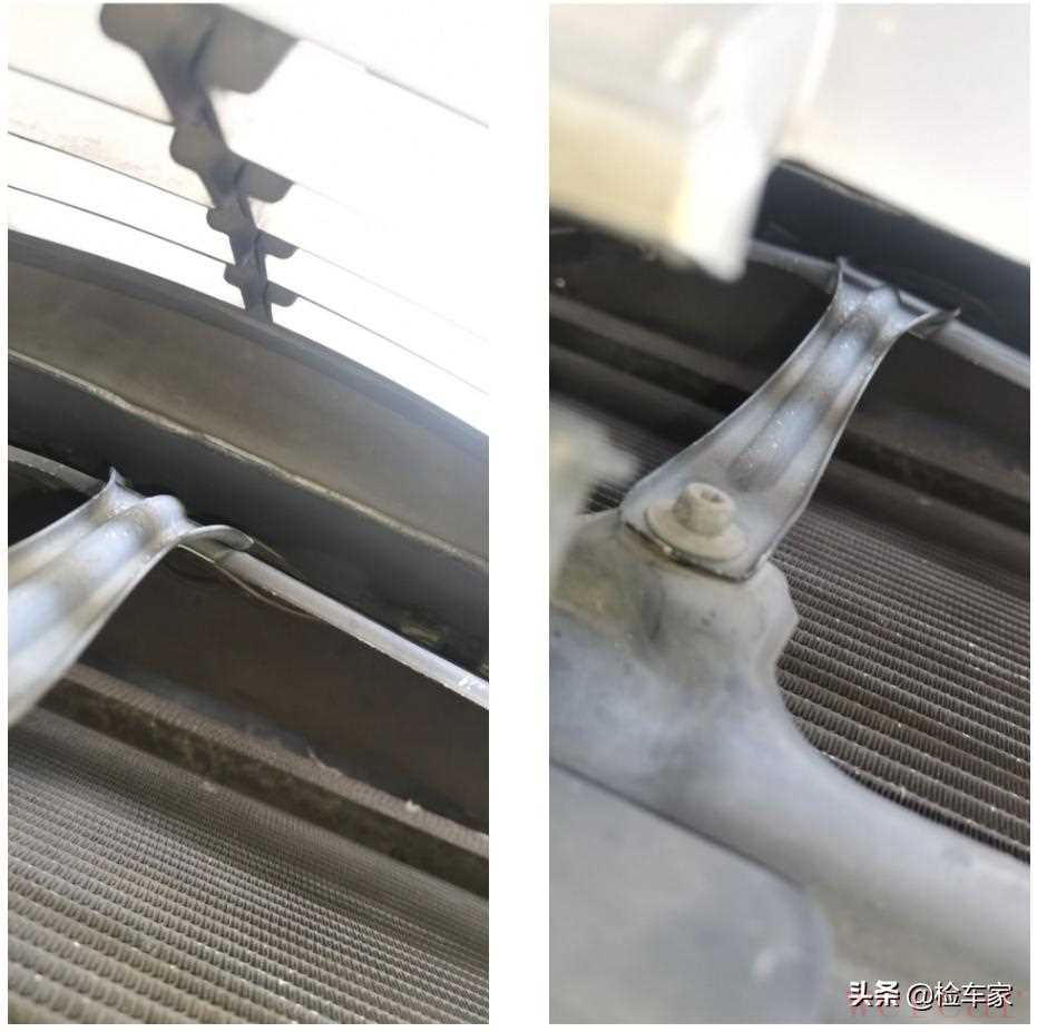 发动机舱里首先从水箱框架里面看过去,可以看到散热器连接管和水箱冷凝器都有过更换,由于前面发生的碰撞没有拆装水箱框架,应该就是时间久了水箱老化漏水导致的更换,毕竟车龄有这么大了,有些更换是非常正常的。