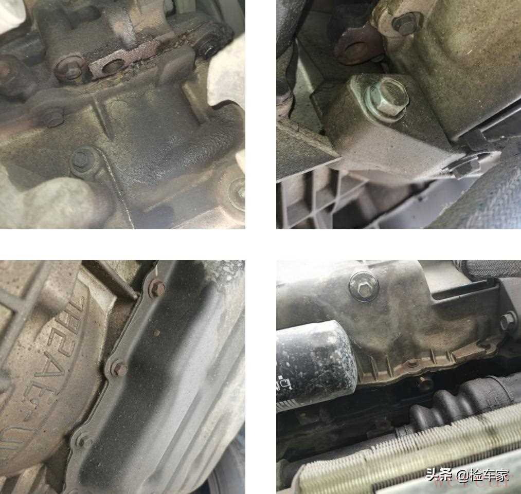 底盘升起来过后主要看一下发动机到底有没有大修,果然,发动机油底壳现在还有渗油的情况,而且还重新打过胶,发动机和变速箱的连接螺丝也有拆装,现在缸体处都还有漏油的情况。所以可以判断发动机确实存在大修了。