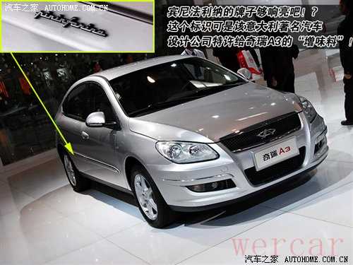 个人认为奇瑞A3两厢的外形相当不错,如果用十分评判的话,我可以给它9.5分!好的评价必定会有原因,源自意大利著名汽车设计公司——宾尼法利纳的作品,奇瑞A3绝对拥有世界级的水准,如果你不信,那就看看车身侧面的标识吧!