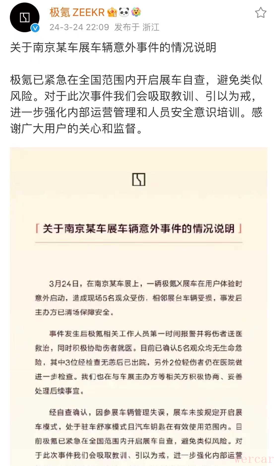 当日晚间,极氪方面公开回应此事。极氪方面表示,当日,一辆极氪X展车在用户体验时意外启动,造成现场5名观众受伤,相邻展台车辆受损,事发后主办方已清场保障安全。
