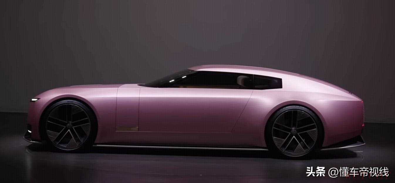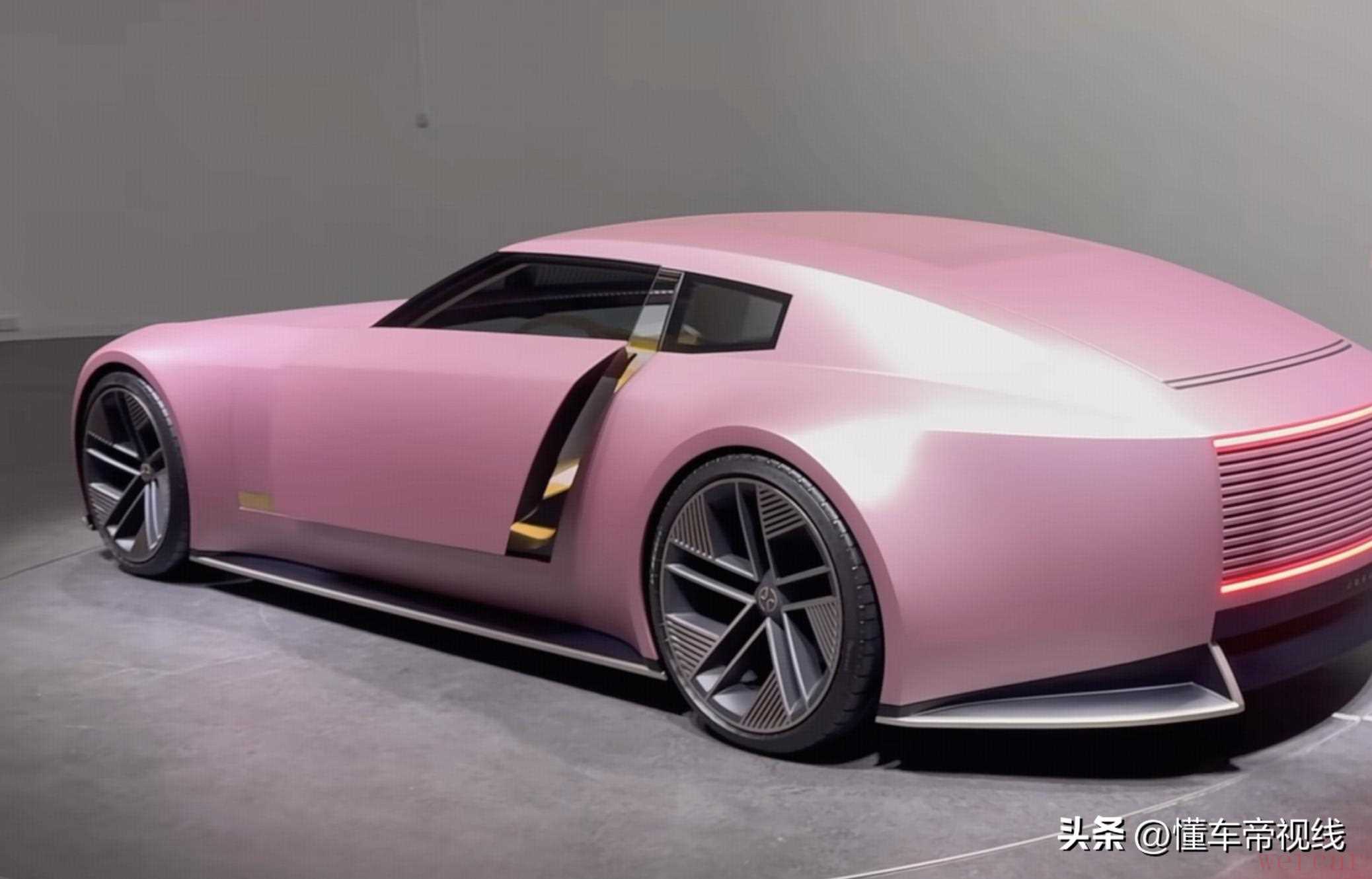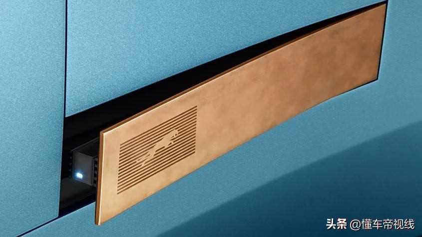车身侧面,捷豹Type 00造型修长,对A柱进行黑化处理,展现出悬浮车顶的视觉效果。此外,该车配备有23英寸轮辋,并在车身下边缘加入带金色装饰条的侧裙。值得注意的是,新车前翼子板可以打开,下方金色饰板具备弹出功能,内部还隐藏有电子配件。
