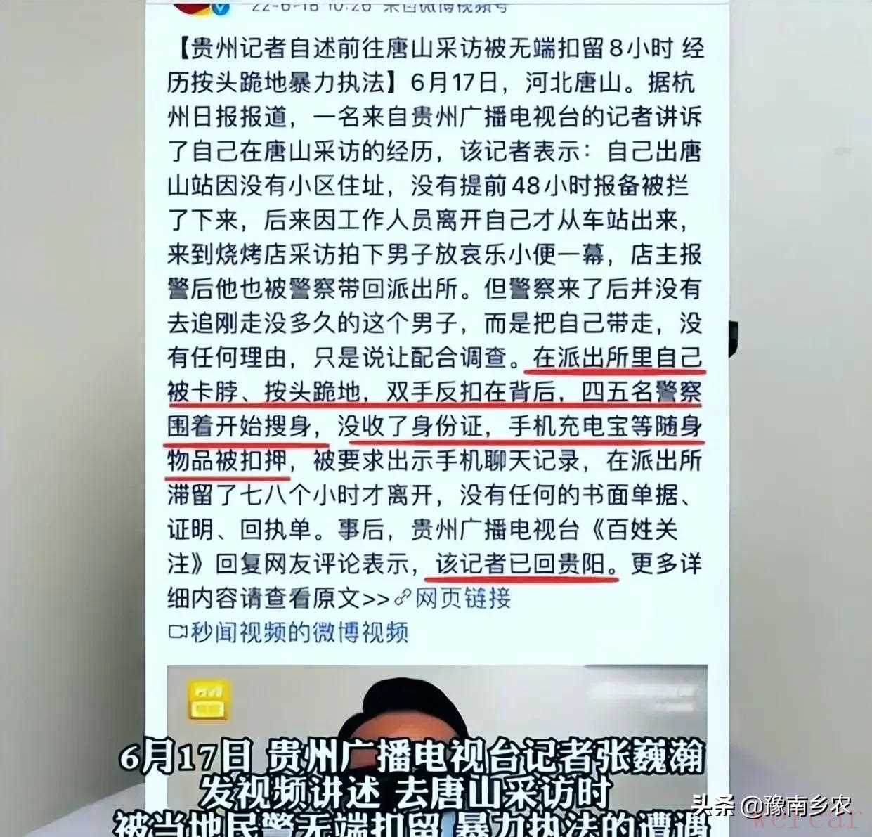 就在几日前有一个贵州广播电视台的官方记者,实名举报到唐山去采访,在各种手续齐全的情况下,被唐山百般刁难并粗暴收身搓地的遭遇。
