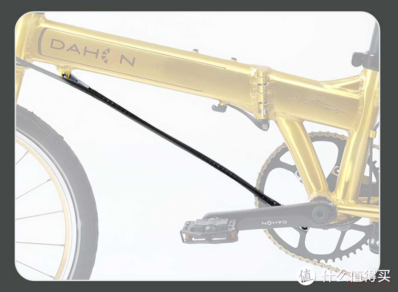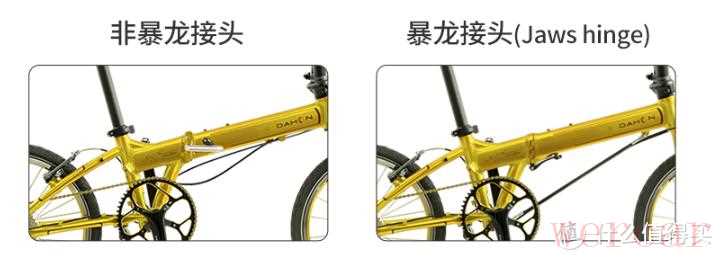 特别是新款采用了DAHON的新技术暴龙接头(Jaws hinge) ,三层锯齿状咬合方式,结合的更加紧密,快拆手柄移到车架下方,大大提升车架一体性和完整性。车架采用方形管,强度更大。