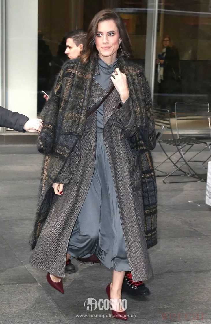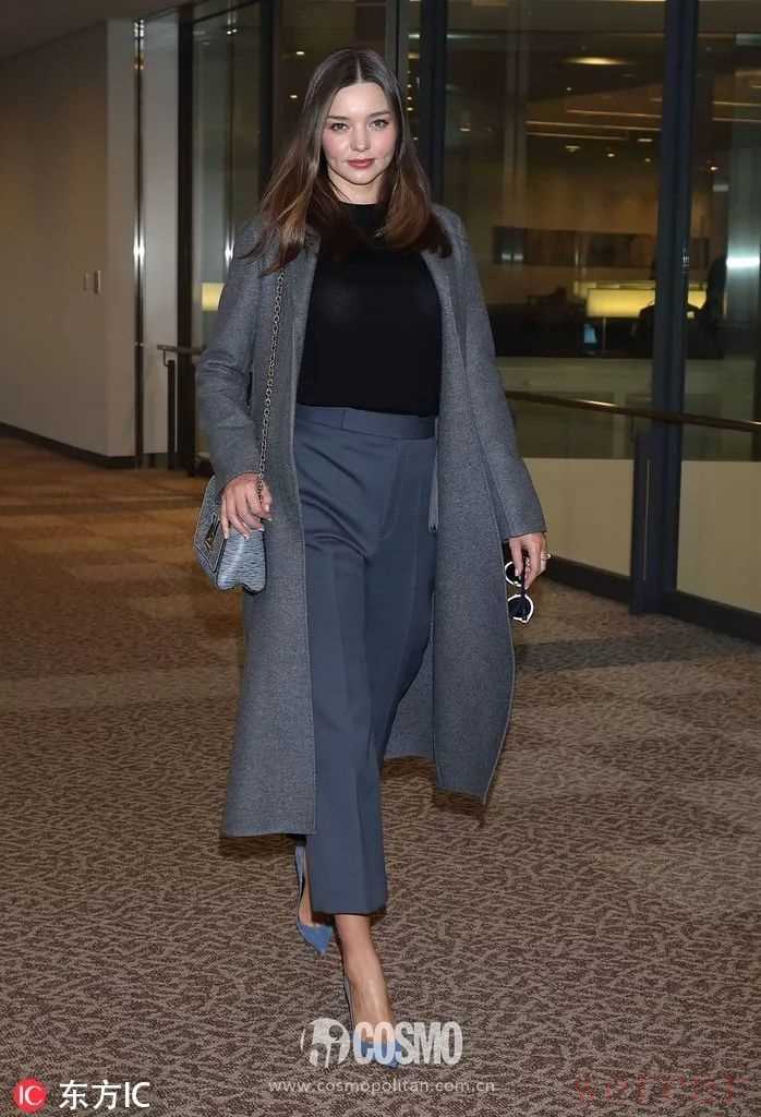 可儿身穿灰色大衣,配上黑色打底和灰色西裤,点睛之处就在脚踩的雾霾蓝色高跟鞋,穿搭干练优雅。
