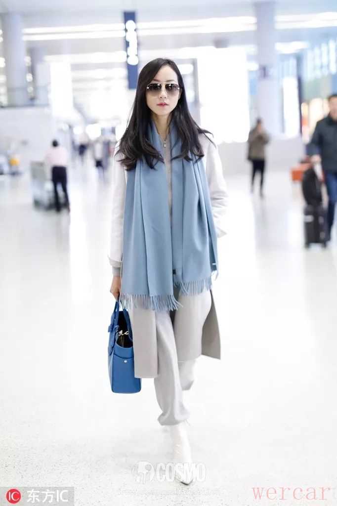 蓝色跟浅灰搭配就可以像韩雪这样用蓝色的围巾和包包点缀,肤白貌美本人了。