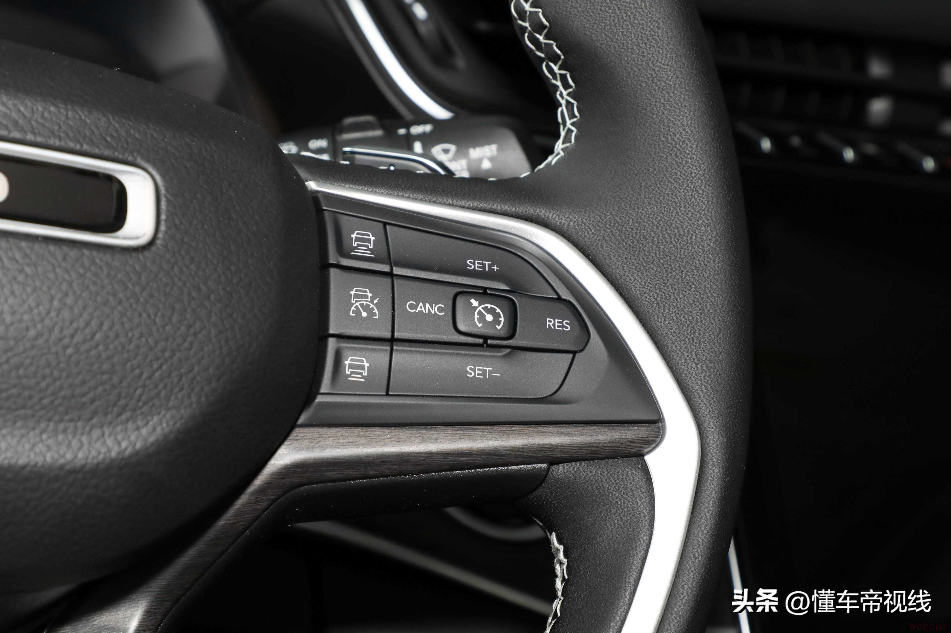内饰方面,大切诺基4xe高峰版车内整体采用墨翠黑配色,局部配合有木纹饰板,在方向盘多功能按键、车窗升降开关等细节,相比远峰版取消了黑色钢琴烤漆质感处理。由于定位全系入门版车型,高峰版在配置方面有所精简,因此在副仪表台区域同步减少部分功能按键。