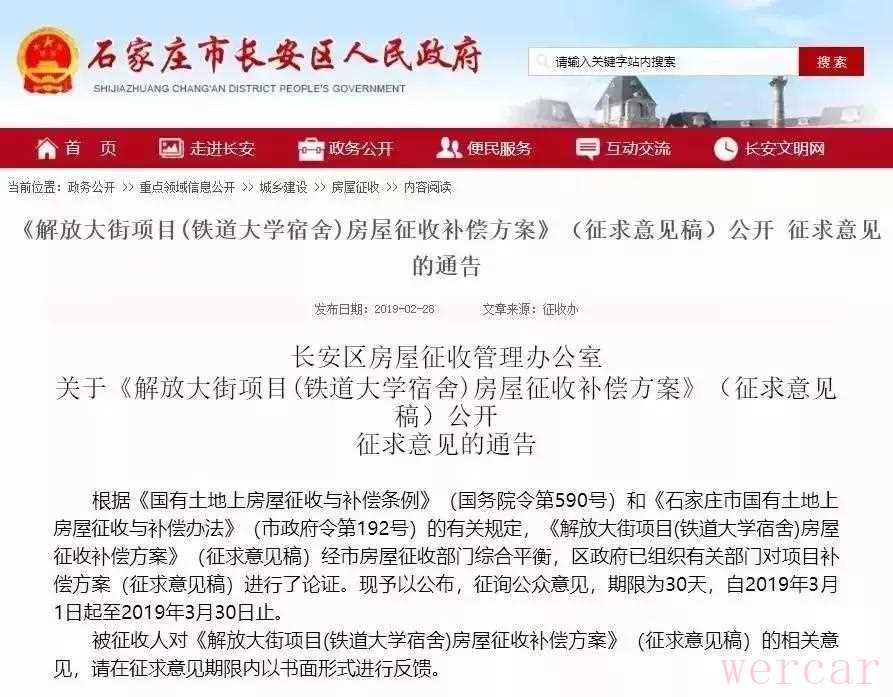 从石家庄市长安区政府官网获悉,长安区发布2则房屋征收补偿方案(征求意见稿),开始公开征求意见,涉及项目为解放大街项目(铁道大学宿舍、锦绣花园)。