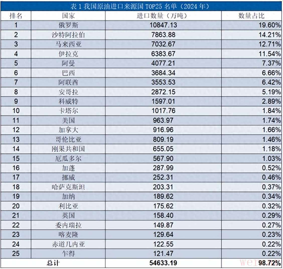据公开报导的2024年数据统计,中东地区(沙特、伊拉克、阿曼等)占进口总量的50%以上,俄罗斯占比19.6%,马来西亚占比12%,见表1。