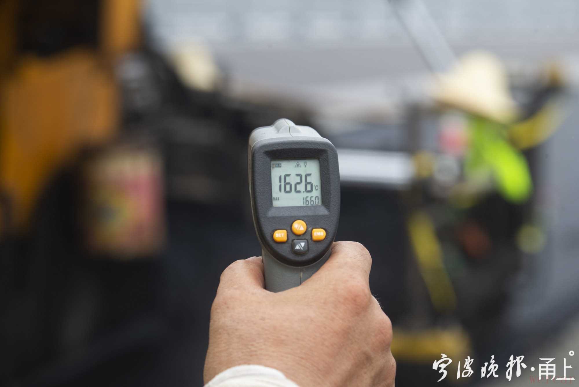驾驶着沥青摊铺机的张银飞“沥青摊铺是建设项目中,现场环境温度最高的作业!”宁波建工工程集团有限公司市政分公司机场快速路南延南段三标段项目负责人刘云亮说:“机场快速路南延南段三标全长1396米,地面主车道沥青已全部完成,高架西半幅的沥青混凝土摊铺已完工,今天下午开始东半幅沥青混凝土摊铺作业,现场共有3辆沥青摊铺车,近40名工人,预计3天左右完成沥青混凝土摊铺工作。”站在铺设了一段时间的沥青路面上,没多久就感到鞋底发烫。厉宗南拿着温度计测量了沥青路面的温度,温度显示为84.6℃。新闻多一点