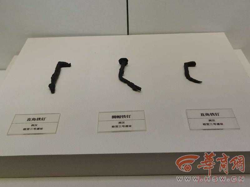 在桂宫遗址还出土了一些铁钉,有大的有小的,大的近30厘米长,有的已经弯曲,是建筑中连接木构建用的。
