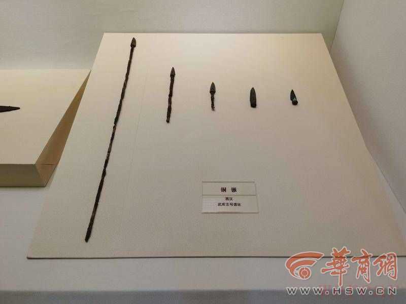 展陈的箭镞中,有一支铜镞带了很长的铁铤,总长度目测近30厘米,使用时铁铤后面还有木杆。这种形制说明它不是一般弓箭用的,而是给弩机配套使用的。弩机有大有小,箭镞也有大有小,作战时可以根据敌军距离来选择不同强度的弩机。