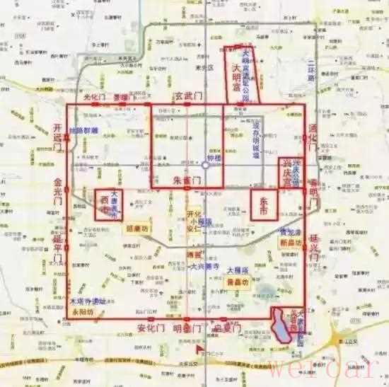 这样一个巨大的都城,没有强大的国力支撑,是根本没有办法建设起来的。对比现在的西安地图,唐代长安城的尺寸大致是现在西安城的一半左右(三环内)。