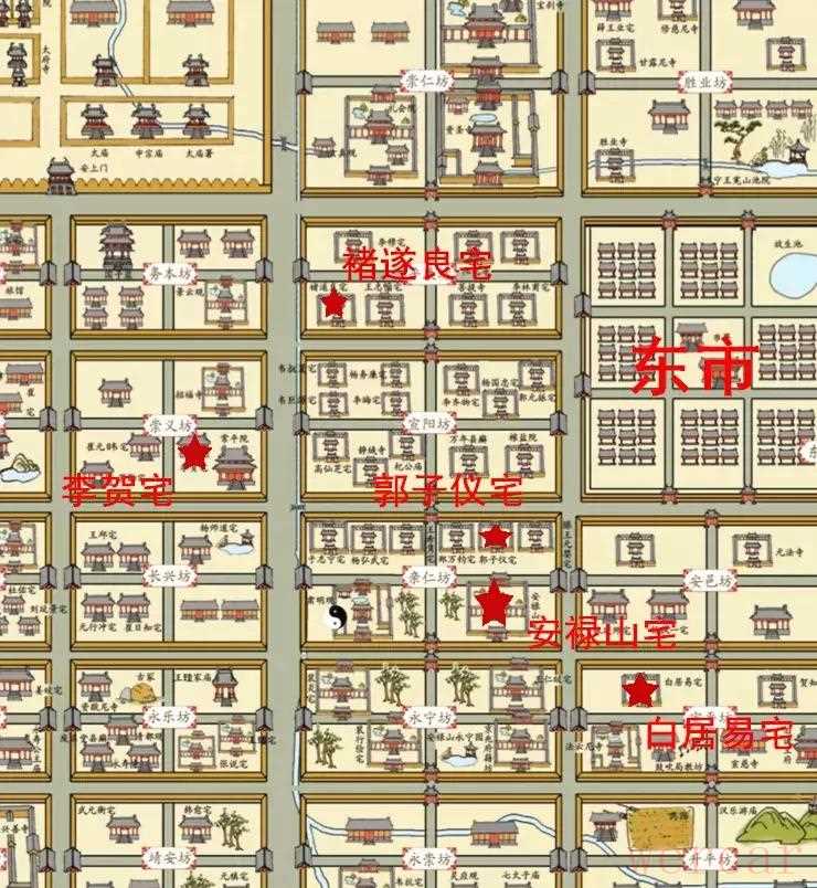 临近东市就愈发热闹了,富贵如安禄山,在这里又有套房,玄宗赏赐公款装修,精美无比。“堂皇三重,皆像宫中小殿”,“什物充牣,以金银织傍框笊籬”等,不知道有没有言过于实。
