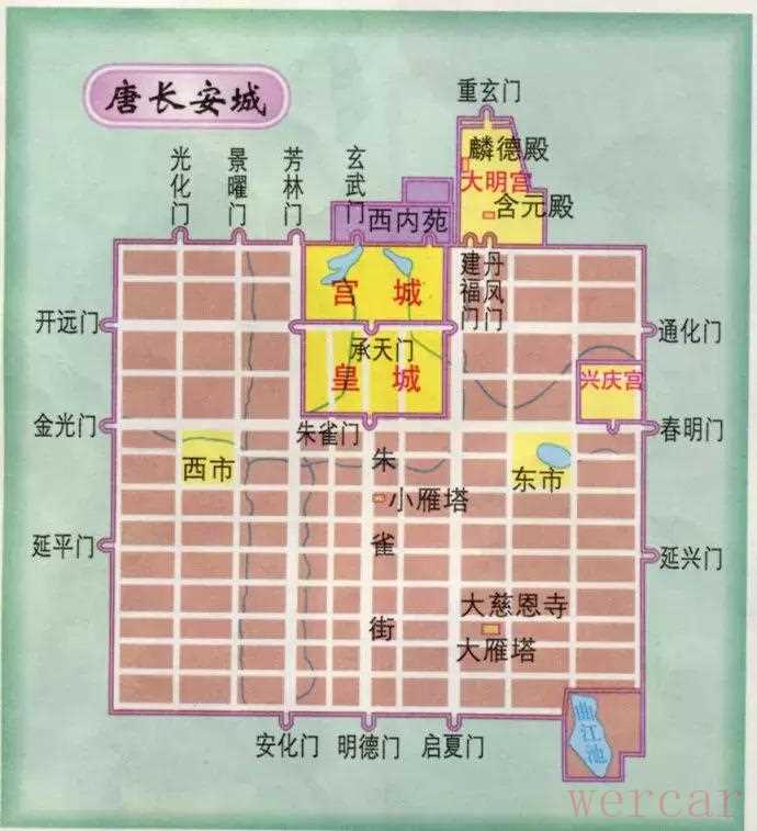 每个坊都被高矮不等的坊墙包围其中,实行严格的坊里邻保制、按时启闭坊门制、宵禁制等有利于加强对城市居民的管理和控制的配套措施。“百千家似围棋局,十二街如种菜畦”,一句诗便道出了长安城彼此平行又相互交错的格局。长安城总体可以分为三个部分:皇城、宫城和外郭城。