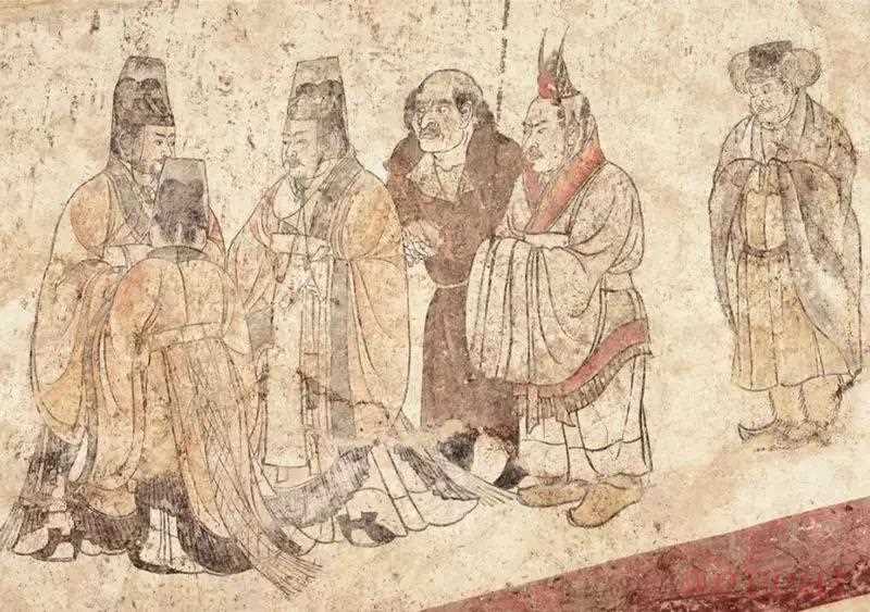 当时的长安城聚集了各式各样的人物,上到朝廷大员,下至普通老百姓,还有到唐朝学习文化和科学的外国人,往来不绝。可以说,是名副其实的国际大都市。专门用来接纳外国使者的鸿胪寺,最多的时候可同时接待四千多名外使。唐章怀太子墓出土壁画,纪年为唐中宗神龙二年(706)。壁画表现了唐朝鸿胪寺官员接待来自不同国家和地区的君长和使节的场景。