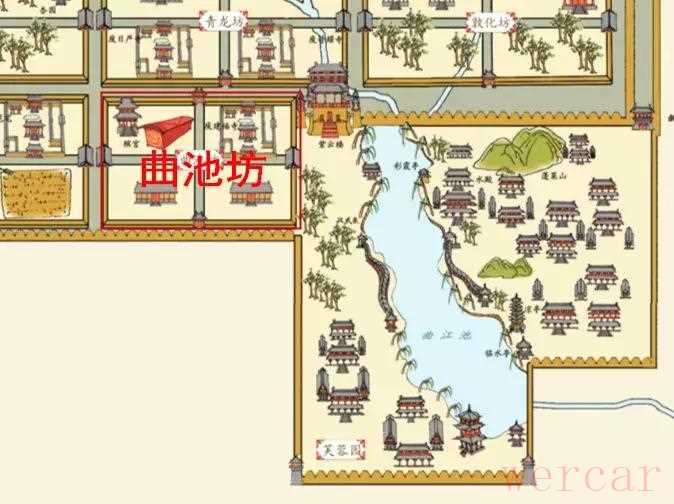 曲池坊紧邻曲江池,曲江池是当时皇族贵戚的主要游览场所。曲江是位于唐长安城东南的风景名胜,因流水屈曲而得名。唐代疏凿为池,烟水明媚,为都城游赏胜地,以“曲江流饮”的盛事而闻名。