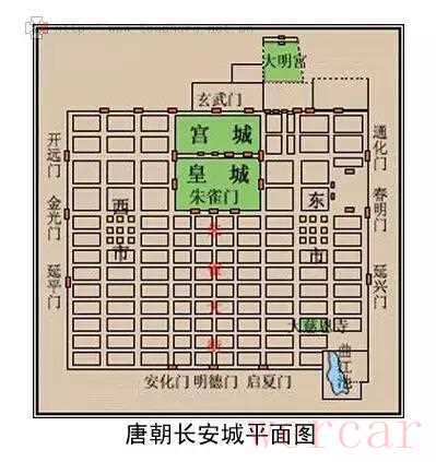 "棋盘式布局:" 长安城是中国乃至世界历史上最严格、最规整的棋盘式城市之一。它由外郭城、皇城、宫城组成,轴线明确,街道笔直。