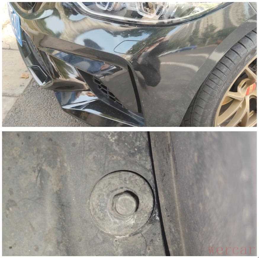 先从车头开始,前杠漆面有脏点,颜色发乌,漆雾橘皮纹非常明显,并且前杠的固定螺丝也是拆过的,所以保险杠是存在拆装修复的。并且现在的杠体局部还有剐蹭划痕,喷漆的工艺也不够好,漆面腻子已经有轻微的开裂了。