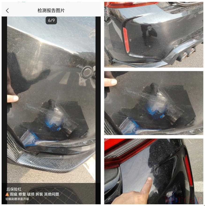检测来到车辆尾部,一上来就发现后保险杠也有拆装喷漆,跟前杠一样也存在划痕剐蹭、腻子开裂的情况,局部因为剐蹭力度稍大还有破损情况。